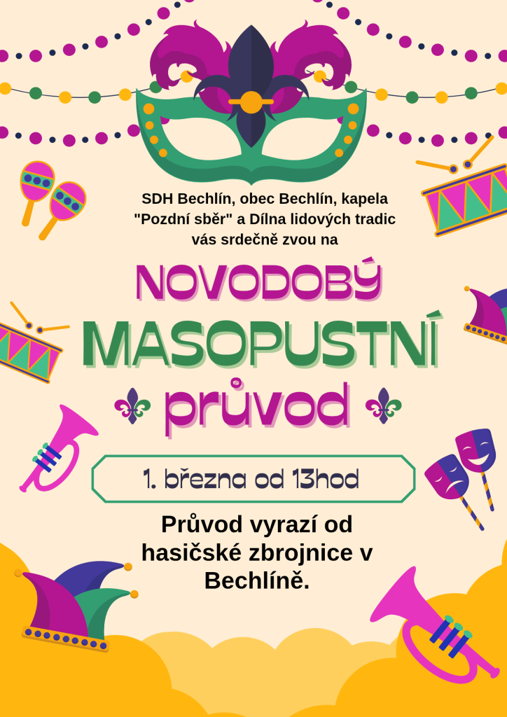SDH Bechlín ve spolupráci s Obcí Bechlín a Dílnou lidových tradic pořádá novodobý masopustní průvod v obci Bechlín, který začíná v 13:00 hodin u hasičské zbrojnice a nabídne tradiční masopustní zábavu s kapelou Pozdní sběr. Přijďte si užít jedinečnou atmosféru této slavnosti! Nezapomeňte s sebou vzít dobrou náladu a úsměv na tváři. Masky jsou vítány.