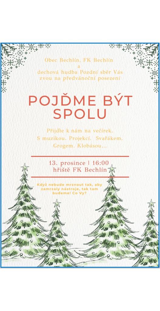 Obec Bechlín, FK Bechlín a dechová hudba Pozdní sběr Vás srdečně zvou na předvánoční posezení s hudbou a teplými nápoji, co zahřejí ruce, ale především srdce. Pojďme být SPOLU.